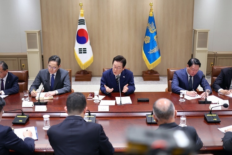 韩国总统李在明与三星集团会长李在镕出席工商界代表沟通会,首尔。11月16日,韩国总统李在明会见三星电子、SK、现代汽车、LG、韩华等韩国主要企业高管,要求相关企业提高对韩国国内投资,避免因美韩投资协议而牺牲国内产业。三星电子当天承诺未来5年投资450万亿韩元扩大其国内业务;SK集团承诺投资600万亿韩元在龙仁建设4家大型半导体制造厂;现代汽车承诺投资125万亿韩元推进AI和自动驾驶等技术研发;韩华集团承诺投资11万亿韩元强化韩国造船和武器制造业务。摄影师:iDaily Media