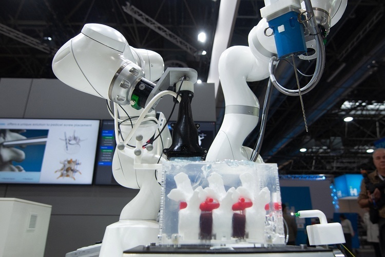 第57届德国杜塞尔多夫医疗器械展(MEDICA),一台中资德企 KUKA 公司研发的手术机器人正在进行演示。11月17日,全球最大的医疗设备展会 MEDICA 在杜塞尔多夫展览中心举行,共有来自72个国家的逾5000家医疗企业参展,涵盖医学诊断、实验室设备、医疗信息技术等领域,展期持续至11月20日,预计将吸引超过8万人参观。德国医学技术协会(BVMed)报告指出2024年德国医疗技术行业市场规模超过410亿欧元,其中出口占比达68%。摄影师:Ying Tang