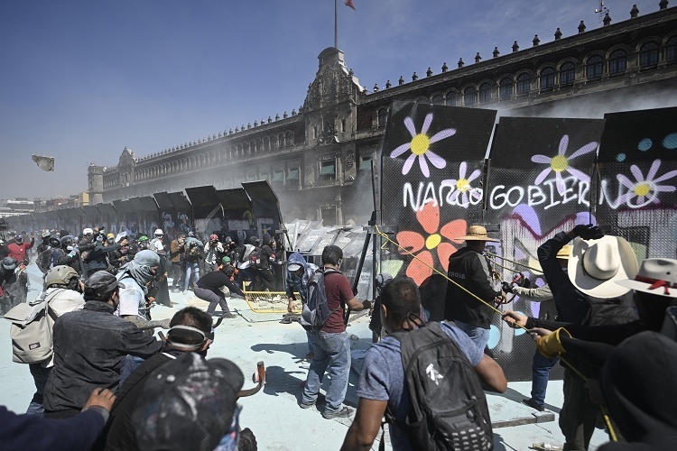 抗议民众试图闯入墨西哥国家宫,墨西哥城。11月15日,墨西哥首都爆发大规模示威活动抗议政府治安维护不力,至少100名警察和20名抗议者在冲突中受伤。本次抗议活动由墨西哥「Z世代」青年团体发起,起因是墨西哥前乌鲁阿潘市市长 Carlos Manzo 在亡灵节活动中遭枪击身亡。墨西哥国家公共安全系统数据显示2025年1至10月该国累计发生20096起凶杀案,平均每天有66.1人遇害。摄影师:Alfredo Estrella