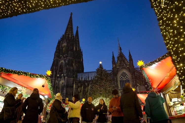 2025年德国科隆大教堂广场圣诞集市开幕。11月17日,科隆大教堂一年一度的圣诞集市正式开幕,本年度共设立超过140个手工艺品和美食摊铺,并现场举行音乐演奏、木偶戏和舞蹈表演等活动,开放时间持续至12月23日。欧盟统计局数据显示2025年第三季度欧元区 GDP 环比增幅仅0.2%,其中德国和意大利均录得零增长。欧洲央行预测欧元区全年经济增长率为1.2%。摄影师:Christopher Neundorf