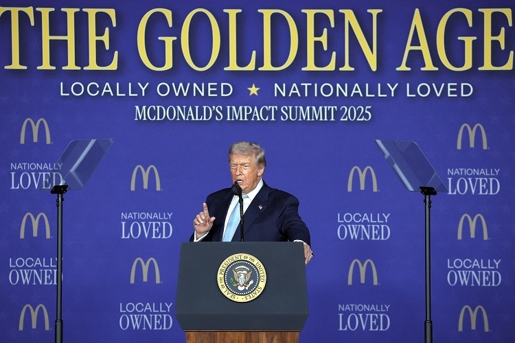 美国总统 Donald Trump 出席「麦当劳影响力峰会」,华盛顿特区。11月17日,美国总统 Trump 在美国最大连锁快餐企业麦当劳公司的加盟商峰会上发表演讲,他宣称「美国正处于黄金时代,物价正在下降」,承诺将降低通胀至「完美水平」。Trump 已于11月14日签署行政令豁免对牛肉、咖啡、香蕉、橙汁等逾200种食品的进口关税。2025年9月美国消费物价指数(CPI)同比上涨3%,涨幅创9个月来新高。全美9月牛肉糜平均价格为每磅6.32美元,同比上涨13.5%。摄影师:Win McNamee