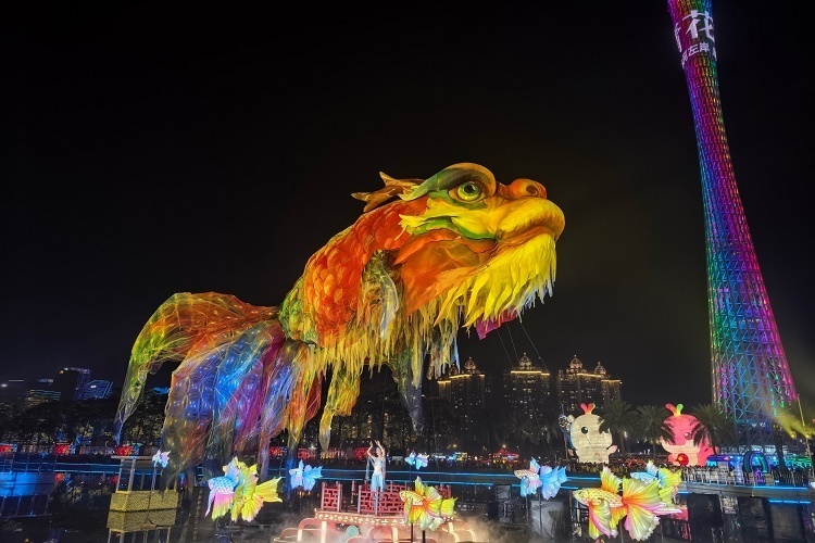 2025年广州国际灯光节举行亮灯仪式,一只27米长的巨型「鳌鱼」彩灯在主会场亮相。这件巨型彩灯的设计灵感来自《山海经》记载的古瑞兽「鳌鱼」,彩灯内填充氦气从而可以在空中悬浮。11月16日,第14届广州国际灯光节正式开幕,本届主题为「智汇湾区·悦动全运」,主会场海心沙亚运公园和花城广场共展出36组灯光艺术作品,展期将持续至11月26日。摄影师:iDaily Media