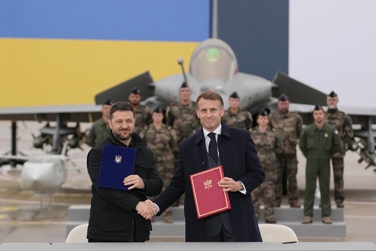 法国总统 Emmanuel Macron 与乌克兰总统 Volodymyr Zelensky 签署军售协议,维拉库布莱空军基地。11月17日,乌克兰总统 Zelensky 自俄乌冲突爆发以来第9次访问法国,两国领导人当天签署一份有效期为10年的军售协议。根据这份协议,乌克兰将从法国购买100架「阵风」战斗机、8套 SAMP-T 防空系统以及 GF300 雷达系统和无人机等武器装备,两国还将在2025年底前启动无人机联合研发及制造项目。摄影师:Christophe Ena
