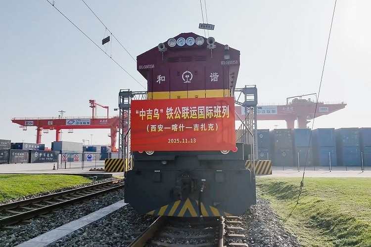 陕西省首列中吉乌 X9015 次国际班列从西安发车,中国陕西省。11月13日,中国西安至乌兹别克斯坦的首条铁公联运国际班列顺利开行。首发班列共装载45个汽车零配件货物集装箱,首先经铁路抵达喀什,然后转公路出境进入中亚地区,全程预计20天,较传统运输方式节省约4至5天。2025年前10个月中亚班列累计开行1.19万列,同比增长22.9%。摄影师:iDaily Media
